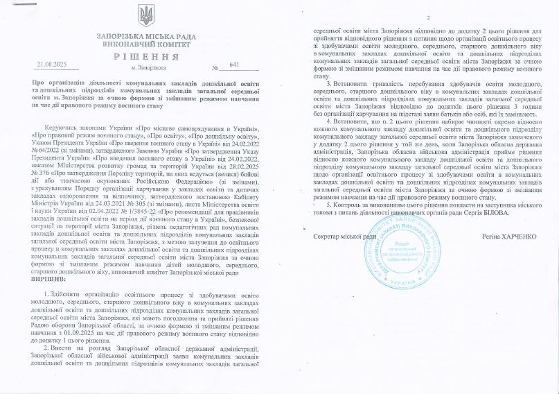 Згідно Розпорядження виконуючої обов'язки міського голови м. Запоріжжя від 21.08.2025 № 641 "Про організацію діяльності комунальних закладів дошкільної освіти..." 2025/2026 навчальний рік розпочато з 01.09.2025 за очною формою зі змішаним режимом навчання (молодший, середній та старший дошкільний вік) та дистанційною формою навчання з використанням доступних технічних можливостей та з урахуванням безпекової ситуації на території.